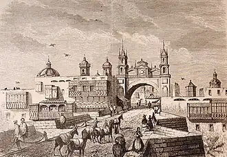 Después de la Guerra de Independencia, Lima se convirtió en la capital de la República del Perú pero el estancamiento económico y desorden político del país paralizó su desarrollo urbano. Esta situación se revirtió en la década de 1850, cuando los crecientes ingresos públicos y privados derivados de la exportación del guano permitieron una rápida expansión de la ciudad.[56] En 1861 la Municipalidad acordó reformar la nomenclatura de las calles: en vez de bautizar cada cuadra con un nombre propio, se acordó usar nombres de ciudades y departamentos del Perú para designar a las vías en su conjunto.[57] A su vez, durante estas décadas el Estado financió la construcción de edificios públicos de gran tamaño para reemplazar los antiguos establecimientos virreinales, entre estos se encuentran el Mercado Central, el Camal General, el Asilo Mental, la Penitenciaría y el Hospital Dos de Mayo.[58] También hubo mejoras en las comunicaciones; en 1850 se completó una línea de ferrocarril entre Lima y Callao y en 1870 se inauguró un puente de hierro sobre el río Rímac, bautizado como Puente Balta.[59] En 1872, durante el gobierno de Balta, el ingeniero norteamericano Enrique Meiggs demolió las murallas de la ciudad previendo un mayor crecimiento urbano a futuro.[38][60] Sin embargo, este periodo de expansión económica también ensanchó la brecha entre ricos y pobres, produciendo un extendido descontento social.[61]