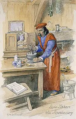 Louis Hébert (1575-1627) fue un boticario parisino que en 1606 acompañó a su primo Pierre Dugua de Mons a la región de Acadia. Vivió en Port-Royal (actual Annapolis Royal, al sur de Nueva Escocia) de 1606 a 1607 (después de que expirara la concesión comercial que se había otorgado a la expedición de Mons) y de 1610 a 1613 (cuando el asentamiento fue destruido por Samuel Argall, vicegobernador de Virginia). Hébert cuidó la salud de los pioneros, supervisó los huertos y cultivó plantas medicinales nativas ofrecidas por los Micmac. Algunas de estas plantas fueron Arisaema triphyllum, Eupatorium perfoliatum e Hydrastis canadensis. En 1617 Hébert recibió una oferta de trabajo de la Compañía de la Nueva Francia a través de Samuel de Champlain y se mudó a Quebec junto con su esposa y tres hijos. Así, Hébert fue el primer boticario europeo en la región de la actual Canadá.