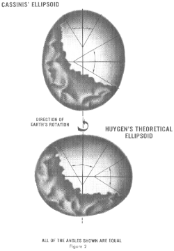 Ese resultado, de ser correcto, significaba que la tierra no era una esfera, sino un esferoide alargado (más alto que ancho). Sin embargo, esto contradecía los cálculos de Isaac Newton y Christiaan Huygens. En 1659, Christiaan Huygens había sido el primero en derivar la fórmula ahora estándar para la fuerza centrífuga en su obra De vi centrifuga. La fórmula jugó un papel central en la mecánica clásica y se conoció como la segunda de las leyes del movimiento de Newton. La teoría de la gravitación de Newton combinada con la rotación de la Tierra le llevó a predecir que la Tierra sería un esferoide achatado (más ancho que alto), con un aplanamiento de 1:230.[22]