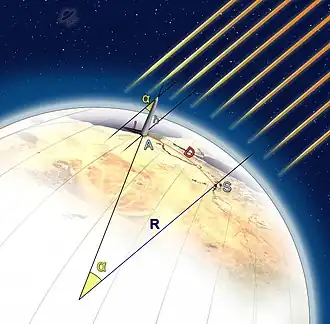 En contraste con sus predecesores que midieron la circunferencia de la Tierra al observar el Sol simultáneamente desde dos lugares diferentes, Abu Rayhan al-Biruni (973-1048) desarrolló un nuevo método al usar cálculos trigonométricos basados en el ángulo entre una llanura y la cima de una montaña, lo que suponía mediciones más simples de la circunferencia de la Tierra y permitieron que una única persona pudiera medirla desde un único lugar.[15][16][17] La motivación del método de Al-Biruni era evitar «caminar por desiertos cálidos y polvorientos» y la idea se le ocurrió cuando estaba en la cima de una montaña alta en la India (Pind Dadan Khan, en la actualidad, Pakistán).[17] Desde lo alto de la montaña, avistó el ángulo de caída que, junto con la altura de la montaña (que calculó de antemano), aplicó a la fórmula de la ley de los senos.[16][17] Si bien se trataba de un método nuevo e ingenioso, Al-Biruni no estaba al tanto de la refracción atmosférica. Para obtener el ángulo de inclinación verdadero, el ángulo de inclinación medido debía corregirse en aproximadamente 1⁄6, lo que significa que incluso con una medición perfecta, su estimación solo podría haber sido precisa dentro de aproximadamente el 20%.[18]