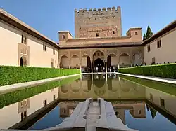 Del conjunto palaciego de la Alhambra conviene destacar el Patio de los Arrayanes, formado por una gran alberca de 30 metros de largo donde se refleja la fachada del palacio, con dos fuentes en los extremos y ribeteada de setos de arrayán, sin más elemento vegetal, lo que constituye una gran simplicidad que, sin embargo, logra un conjunto de armónica belleza. El Patio de los Leones está hoy día exento de vegetación, y solo conserva la fuente central, en la que convergen diversas canalizaciones de agua, pero en su día este patio estaba poblado de diversas plantas, situadas en los rectángulos formados por los canales en forma de cruz. Completan el conjunto el Patio de Lindaraja, de época renacentista, con una fuente central y poblado de naranjos, cipreses y bojes; y el Patio del Partal, planificado nuevamente alrededor de una gran alberca frente al palacio, cuyo jardín —del siglo XX— conecta con el parque exterior de la Alhambra.[31]