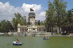Entre los proyectos reales uno de los más destacados fueron los Jardines del Buen Retiro de Madrid, una iniciativa de Felipe IV que confió al conde-duque de Olivares, quien encargó el proyecto a los arquitectos Giovanni Battista Crescenzi y Alonso Carbonel, mientras que los jardines corrieron a cargo del italiano Cosimo Lotti. Las obras se iniciaron en 1628, pero a la muerte del rey en 1665 se abandonó el proyecto. Los trabajos se efectuaron sin un trazado general, tan solo una serie de espacios articulados entre sí y abiertos al coto de caza colindante. Los jardines se fueron extendiendo por sucesivas parcelas a lo largo de un vasto territorio (desde Vallecas hasta Alcalá), que contaba con jardines de trazado geométrico, frondosas arboledas, huertas y estanques. El jardín más antiguo es el llamado Ochavado, que se caracterizaba por sus calles cubiertas de celosías, y que contaba con un teatro, casinos, una pajarera, un estanque («de las Campanillas») y unas rías navegables donde se realizaban espectáculos de naumaquia.[65] Junto a los apartamentos reales se encontraba el Jardín del Príncipe, de planta formal geométrica, ubicado en un largo rectángulo dividido en dieciséis compartimentos, en dos hileras de ocho cuadros, con dos fuentes monumentales. Al norte de este se hallaba el Jardín de la Reina, formado por cuatro compartimentos de boj o mirto recortado, con una fuente central y una estatua ecuestre de Felipe IV, obra de Pietro Tacca (actualmente en la Plaza de Oriente). Más al norte se encontraba el Jardín del Rey, dividido en dos partes por el edificio del Casón, cada una de ellas con cuatro compartimentos de boj o mirto tallado y una fuente central. Todos los jardines estaban jalonados de estatuas —la mayoría de escultores italianos—, y contaban con ermitas, grutas, un laberinto, estanques y canales, pabellones y cenadores, paseos arbolados y varios eriales en la periferia, como el Campo Grande, el Prado Alto y el Campo de San Blas.[83]
