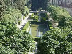 Uno de los primeros exponentes de jardín italiano en España se produjo en los Reales Alcázares de Sevilla a principios del siglo XVI, por instancia de Carlos I. Entonces se amplió el jardín mudéjar configurado en tiempos de Pedro I el Cruel con el Cenador de la Alcoba, un pabellón construido con motivo de la boda de Carlos I con Isabel de Portugal. Fue obra de Juan Hernández, de planta cuadrada, con galerías porticadas y cubierto por una cúpula de media naranja, y todo recubierto de azulejos.[61] Otra de las actuaciones de Carlos I fue en la Alhambra, donde en 1527 construyó un palacio renacentista diseñado por Pedro Machuca, adornado por unos pequeños jardines en dos patios colindantes al palacio: el de Reja, junto a las habitaciones del emperador, y el de Lindaraja, donde anteriormente había un mirador perteneciente al Salón de los Ajimeces —cuya vista quedó interrumpida por el palacio—, y donde se ubicó un jardín con fuente renacentista y taza de mármol árabe. En 1528 mandó reparar los Jardines del Real de Valencia, cuyos trabajos se extendieron hasta finales de siglo —en 1598 fueron escenario de la boda de Felipe III y Margarita de Austria-Estiria—. Presentaban estos tres recintos ajardinados, junto a huertas de hortalizas y árboles frutales, especialmente naranjos y limoneros. El jardín principal, el del vivero, estaba configurado en cuatro partes, al estilo del chahar bagh persa, con figuras de arrayán recortadas en forma de animales o con motivos heráldicos.[62] Un último proyecto de Carlos I fue la adecuación del entorno del Monasterio de Yuste, donde se retiró tras su abdicación en 1556; en sus habitaciones tenía un mirador que daba a una amplia huerta de naranjos.[57]