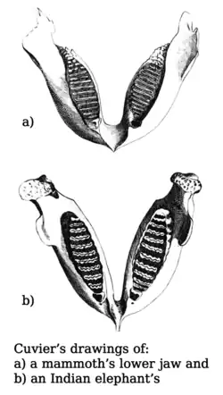 En 1796, Georges Cuvier (1769-1832) presentó Memoire sur les especes d'Elephants tant vivantes que fossiles, que supuso uno de los principales hitos en la paleontología, ya que se aportaban por primera vez pruebas irrefutables a favor de las extinciones. Reflexionó sobre los elefantes vivientes y los elefantes fósiles comparando los esqueletos de elefantes indios y africanos con los fósiles de mamuts y de un animal que más tarde sería denominado mastodonte utilizando anatomía comparada. Estableció por primera vez que los elefantes indios y los africanos eran especies diferentes, y que los mamuts se diferenciaban de ambos y por tanto debían estar extintos. Incluso llegó a la conclusión de que el mastodonte era otra especie extinta que también difería de los elefantes indios o africanos, aún más que los mamuts. Cuvier hizo otra poderosa demostración del poder de la anatomía comparada en la paleontología cuando presentó un segundo documento en 1796 acerca de un gran esqueleto fósil en Argentina, que nombró Megatherium y que identificó como un perezoso gigante comparando su cráneo al de las dos especies vivas de perezoso arborícola. El innovador trabajo de Cuvier en paleontología y anatomía comparada condujo a la aceptación generalizada de la extinción.[McG. 1] También llevó Cuvier a abogar por la teoría geológica del catastrofismo para explicar la sucesión de organismos revelada por el registro fósil. También señaló que, dado que ni los mamuts ni los rinocerontes lanudos pertenecían a la misma especie que los elefantes y rinocerontes que actualmente habitan en los trópicos, sus fósiles no podían ser utilizados como evidencia de una tierra en enfriamiento gradual. Su contemporáneo Lamarck (1744-1829) fue el primero en desarrollar una teoría evolucionista; sin embargo ni sus argumentos ni el mismo proceso evolutivo fue admitido por sus coetáneos, y fue uno de sus principales oponente el propio Cuvier, defensor a ultranza de las teorías catastrofistas.