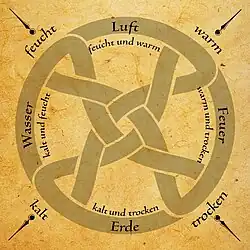 La búsqueda por tratar de definir lo que no se percibía de la materia continuó por Aristóteles,[17] cuyas ideas ganaron el mundo europeo occidental durante más de 2000 años. Él pensaba que los «elementos» a los que se refería Empédocles eran combinaciones de dos pares de propiedades opuestas: frío y calor; humedad y sequedad. Estas propiedades podían combinarse entre sí excepto con sus opuestos, de tal manera que podían formarse cuatro parejas distintas, cada una de las cuales daba origen a un «elemento» distinto: calor y sequedad originan el fuego; calor y humedad, el aire; frío sequedad, la tierra; y frío y humedad, el agua.