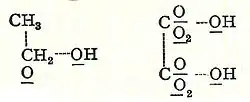 En 1856, el químico escocés Archibald Couper comenzó a investigar acerca de la bromuración del benceno en el laboratorio de Charles Wurtz en París.[12] Un mes después de la aparición del segundo artículo de Kekulé, la teoría de estructura molecular independiente y muy parecida a la de Couper fue publicada. Él ofreció una idea muy concreta de la estructura molecular, proponiendo que los átomos se unían entre sí como Tinkertoys en estructuras específicas tridimensionales. Couper fue el primero en usar líneas entre los átomos, en conjunción con el método ya usado de usar corchetes, para representar enlaces; también postuló cadenas rectas de átomos como la estructura de algunas moléculas, y estructuras de anillo para otras como el ácido tartárico y el ácido cianúrico.[13] En publicaciones posteriores, los enlaces de Couper se representaron usando líneas rectas punteadas (aunque no se sabe si esto fue la preferencia del typesetter como con el alcohol y el ácido oxálico mostrados a continuación: