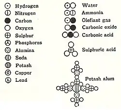 De forma similar a éstas ideas, en 1803 John Dalton usó el peso atómico del hidrógeno, el elemento más ligero, como unidad y determinó, por ejemplo, que el radio para el Anhidro nitroso es de 2 a 3, lo cual da la fórmula N2O3. Curiosamente, Dalton imaginó incorrectamente que los átomos se "enganchaban" entre sí para formar moléculas. Más tarde, en 1808m Dalton publicó su famoso diagrama de "átomos" combinados:
