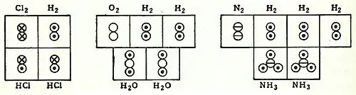 En 1789, William Higgins publicó su punto de vista en lo que llamaba las combinaciones de las partículas "últimas", lo cual sentó las bases para el concepto de enlaces de valencia. Por ejemplo, de acuerdo a Higgins, si la fuerza entre la última partícula de oxígeno y la última partícula del nitrógeno fuera de 6, entonces la magnitud de dicha fuerza se dividiría equitativamente, e igual con otras combinaciones de partículas últimas: