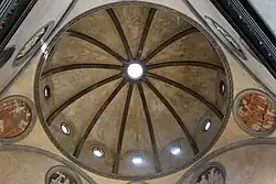 Los ejemplos de Florencia son principalmente de principios del Renacimiento, en el siglo XV. Las ciudades dentro de la zona de influencia de Florencia, como Génova, Milán y Turín, produjeron principalmente ejemplos más tarde, a partir del siglo XVI.[Me. 1] Las cúpulas de Brunelleschi en San Lorenzo y la capilla Pazzi (1442-1443) las establecieron como un elemento clave de la arquitectura renacentista.[7] Su plan para la cúpula de la capilla Pazzi en la basílica de la Santa Croce (1430-1452) ilustra el entusiasmo renacentista por la geometría y por el círculo como la forma suprema de la geometría. Doce costillas entre doce ventanas circulares convergen en un pequeño óculo. La cúpula circular descansa sobre pechinas decoradas con medallones circulares de cerámica florentina. Este énfasis en lo esencial geométrico será muy influyente. La cúpula de la Certosa di Pavia (1396-1473) tiene un diseño de rueda con nervaduras o radios. La cúpula de San Sisto en Piacenza (1499-1514) es circular y también incluye pechinas con medallones circulares.[8] Otro ejemplo temprano es el diseño de Giuliano da Sangallo en 1485 de una cúpula en la iglesia de Santa Maria delle Carceri en Prato. Como el de la capilla Pazzi, la cúpula es de nervaduras.[Be. 2] Otra cúpula renacentista con un diseño de rueda con nervaduras o con radios es la de la Madonna di Campagna en Piacenza (1522-1528).[9]
