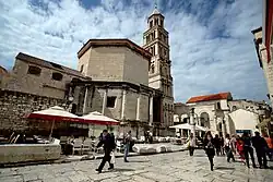 Entre los ejemplos del siglo III destacan la cúpula de ladrillo del mausoleo de Diocleciano y el mausoleo de Villa Gordiani.[58] La Villa Gordiani también conserva restos de una cúpula corneada ovalada.[59] El mausoleo de Diocleciano utiliza pequeñas trompas arqueadas de ladrillo construidas a partir de una base circular en un patrón de escamas superpuestas, llamado "cúpula de trompas escalonadas". El patrón de escamas fue un motivo helenístico popular adoptado por los partos y los sasánidas, y tales cúpulas probablemente estuvieran relacionadas con las "bóvedas de trompa" persas.[60] Además del mausoleo, el Palacio de Diocleciano también tiene una rotonda cerca del centro del complejo que pudo haber servido como sala del trono. Tiene nichos laterales similares a los de un mausoleo octogonal, pero estaban ubicados al final de una sala aparentemente con bóveda de cañón como la disposición que se encuentra en los palacios sasánidas posteriores.[61] Las cúpulas de mampostería fueron menos comunes en las provincias romanas, aunque el "Templo de Venus" del siglo III en Baalbek se construyó con una cúpula de piedra de 10 m de diámetro.[13] Una cúpula de piedra en voladizo de 5,806 m de diámetro, más tarde conocida como "Arthur's O'on", estaba ubicada en Escocia, tres kilómetros al norte del fuerte de Falkirk en el Muro de Antonino, y puede haber sido un monumento de victoria romano del reinado de Carausio. Fue destruido en 1743.[62]