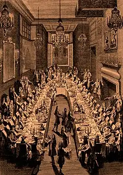 Para los romanos la comida principal era la cena, el convivium («vivir juntos»), a la que asistían las esposas, a diferencia de los griegos. Este tipo de banquete se centraba en la comida y, aunque bebían vino, no lo hacían con la profusión de los griegos. Por lo general se servían tres platos: gustatio (aperitivos), primae mensae (plato principal) y secundae mensae (postre). La comida se servía en fuentes y los comensales se servían la comida encima de rebanadas de pan. El aperitivo comenzaba con un vino endulzado con miel, el mulsum; le seguían pequeños bocados como huevos, caracoles, lechuga, salchichas, ostras y porciones de pescado en vinagre. El plato principal podía incluir carne, pescado, marisco, verduras, legumbres y gachas. El postre solía ser de frutas, nueces y tortas con miel.[62]