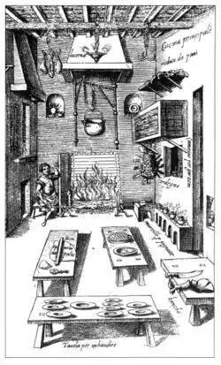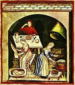 Los utensilios eran de barro o madera para las clases pobres, mientras que la nobleza podía disponer de objetos de oro, plata y vidrio veneciano; entre la burguesía empezó a extenderse a partir del siglo XIII el uso de utensilios de estaño.[75] Las ollas se hacían de bronce o latón.[75] Desde el siglo XIV fueron tomando preeminencia las ciudades, donde la burguesía fue ascendiendo en el estatus social. Aumentó el lujo en las comidas, que se denotó especialmente en las vajillas, que incluían utensilios de materiales preciosos, como cucharas, cuchillos, platos, vasos, saleros e incluso mondadientes. En esta época empezaron a usarse trípodes de hierro para el fuego, sobre los que se colocaban cazos o sartenes.[78]