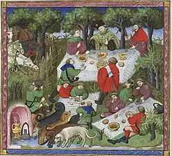 Durante la Edad Media, como en otros ámbitos de la cultura, la gastronomía era bastante parecida en casi toda Europa, si bien con variedades regionales, especialmente en la crianza de ciertos animales: en el litoral atlántico del noreste de Europa, desde Bretaña hasta Países Bajos, predominaba la carne de vacuno; en el centro de Francia y Alemania, el cerdo; en Inglaterra y el Mediterráneo, la oveja. Ello se reflejaba en las recetas practicadas en cada país. Otro factor esencial eran las clases sociales: las clases altas consumían más carne, la cual además era más fresca; cuando en las clases bajas se comía carne era en general conservada. Las clases altas disponían también de caza, así como grandes cantidades de aves de corral y silvestres. Igualmente, tenían más fácil acceso al pescado fresco, tanto marino como de agua dulce. Pese a todo, la mayor dependencia alimentaria seguía siendo de los cereales, que era el principal alimento de la dieta, nuevamente con diferencias sociales: los ricos comían pan de trigo, los pobres de centeno, cebada o avena. Un cierto cambio se produjo a mediados del XIV tras la Peste Negra, en que la población se redujo notablemente y hubo mayor proporción de carne por persona. Las verduras de huerto servían más para dar sabor a los platos que como productos de consumo. Aparte de los alimentos, existía un acervo común en cuanto a recetas y cierto número de platos era conocido en la mayor parte de Europa, entre ellos: el brouet, un potaje de carne o pescado troceados; el blanc-manger, un plato de ternera, cerdo o pollo con arroz y condimentos; el mortress, un plato de pollo, cerdo o pescado hervidos con leche de almendra espesada con migas de pan o huevo; o el rissoles, unos trozos de carne, pescado o fruta con especias y harina fritos en bolas o tortas.[70]
