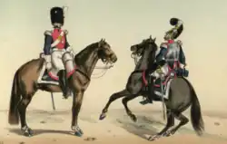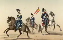 También en 1841 la Guardia Real fue constituida en dos compañías de alabarderos para la guardia del interior del palacio, y dos regimientos de infantería y dos de caballería para la guardia exterior. La infantería peninsular se organizó en veintiocho regimientos de tres batallones cada uno, y la caballería en quince regimientos. La milicia provincial se constituyó en cincuenta batallones independientes.[17]: 259–262 Espartero fue depuesto en 1843 tras un pronunciamiento apoyado por los generales Serrano, O'Donnell y Narváez, tras lo que Isabel II fue declarada mayor de edad y asumió el trono. En 1844 se creó la Guardia Civil como instituto armado dependiente del Ministerio de la Guerra en lo concerniente al personal y el material, y del Ministerio de la Gobernación para su despliegue y servicio, con responsabilidades similares a las anteriormente asignadas a las milicias en el ámbito del orden interior. Inicialmente se compuso de catorce tercios, cada uno de ellos con varias compañías de infantería y un escuadrón o sección de caballería.[19] El año siguiente se promulgó la Constitución de 1845, en la que desaparecía la mención a la Milicia Nacional. Durante el resto de la década, que incluyó un segundo levantamiento carlista, sucesivas reformas integraron las tropas de continuo servicio y las milicias provinciales hasta que en 1849 se estableció que la infantería peninsular se formara en cincuenta regimientos de línea y dieciocho batallones de cazadores, con el batallón 3º de cada regimiento de línea y la 5.ª y 6.ª compañía de cada batallón de cazadores formando la fuerza de reserva, quedando extinguidas las unidades de milicia.[17]: 287–290 En 1849 se creó en Alcalá de Henares el Establecimiento Central de Instrucción de la caballería y al final de ese año la caballería peninsular estaba constituida en dos regimientos de carabineros, trece de lanceros y ocho de cazadores. En 1855 un nuevo gobierno progresista volvió a crear la milicia provincial con ochenta batallones, y redujo el número de regimientos de infantería de línea a cuarenta y uno, con dos batallones cada uno, y el de batallones de cazadores a quince, con seis compañías cada uno. En 1855 la caballería contaba con cuatro regimientos de carabineros y doce de lanceros, y tres regimientos y dos escuadrones independientes de cazadores. La artillería contaba con cinco regimientos de entre dos y tres brigadas cada uno, tres brigadas montadas, dos brigadas de montaña, una brigada a caballo y cinco brigadas fijas; y los ingenieros con un regimiento de tres batallones, con cada batallón compuesto por cuatro compañías de zapadores, una de minadores y una de pontoneros.[17]: 293–318