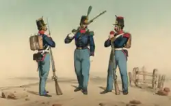 El régimen liberal establecido en 1820 restauró la Constitución de Cádiz, subió el sueldo de los militares de baja graduación, y redujo el tamaño del ejército permanente, al mismo tiempo que potenció las milicias provinciales. También disolvió los tres regimientos suizos del Ejército, estipulando que sus miembros pudieran pasar a otros unidades si tomaban la nacionalidad española. El gobierno sustituyó las banderas de infantería por una nueva insignia que consistía en un león dorado que sostenía la constitución en el tope de un asta, al estilo de las águilas romanas. En 1821 la infantería se organizó en batallones independientes identificados por su número, desapareciendo los regimientos y sus nombres.[11]: 436–450 En 1822 estalló una guerra civil en la península entre el gobierno constitucional y partidarios sublevados del antiguo régimen. En julio hubo una sublevación de la Guardia Real que fue sofocada por la Milicia de Madrid, mientras hubo levantamientos en otros puntos de España, siendo los insurgentes absolutistas especialmente activos en Cataluña y el territorio vasco-navarro.[11]: 414–416 Francia intervino en 1823 para devolver a Fernando VII el poder absoluto, enviando un ejército denominado los Cien Mil Hijos de San Luis que, junto con fuerzas absolutistas españolas, derrotó a las fuerzas liberales.