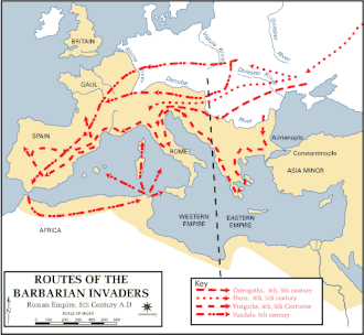 Las invasiones bárbaras o, de forma más neutra en alemán, el «período de migración de los pueblos» (Völkerwanderungzeit) tuvieron lugar en un momento de gran debilidad tanto para el Imperio romano de Occidente como para el Imperio romano de Oriente. El resultado fue la desaparición del primero y su reemplazo por reinos germánicos; en el este, el hecho de poseer un imperio más rico, más urbanizado y más estable que su contraparte occidental permitió a los emperadores comprar la paz y asegurar la supervivencia del imperio. En ambos casos, la transformación de las tradiciones políticas, económicas y culturales habrían asegurado la unidad del imperio.[20]