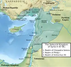 En el norte, el sátrapa grecoiranio Ptolomeo se autoproclamó rey de Comagene en el 163 a. C.,[115] mientras que los árabes abgáridas gobernaban Osroene de forma independiente desde el 132 a. C.[116][117] La revuelta macabea en Palestina inauguró el reino asmoneo en el 140 a. C.[118] Los nabateos, más al sur, habían mantenido su reino desde el siglo III a. C.[119] Esto convirtió a los seléucidas en un estado débil y vulnerable, limitado a partes de Siria y Líbano.