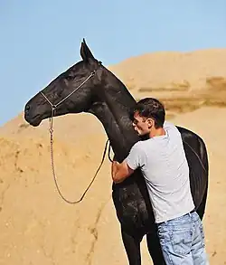 La sensibilidad en cuanto al vínculo con el caballo creció y se afianzó en muchos lugares,[26][27][28] y la hipofagia fue objeto de un rechazo cada vez más fuerte en los países occidentales.[29] Por otra parte, la moda de la equitación etológica se afirmó cada vez más,[30] entre otras cosas por la influencia que han tenido ciertos filmes de éxito, como por ejemplo, The Horse Whisperer (año 1998).[31] La producción artística no ha olvidado al caballo, ni en los filmes de wéstern ni en la literatura, y como prueba de ello, por ejemplo basta recordar las novelas de la serie El corcel negro (del escritor Walter Farley).[32][33]