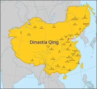 La ira ante las concesiones de los Qing y la sorpresa ante su debilidad ya estaban provocando rebeliones ante las desastrosas inundaciones de principios de la década de 1850, entre otras cosas, desplazando la desembocadura del río Amarillo desde el sur de la península de Shandong hasta el norte, arruinando y desplazando a millones de personas. En 1851, Hong Xiuquan comenzó una revuelta contra la dinastía Qing, proclamando que sus gobernantes eran "asquerosos bárbaros y bestias" que habían "llevado a China a la desesperación". Su Rebelión Taiping, que se inspiraba en planteamientos cristianos adaptados a China, tomó rápidamente el control de gran parte del sureste de China.[16] Con la ayuda de los británicos y franceses, que pensaron que si dejaban caer a los Qing los nuevos mandatarios no asumirían los altísimos compromisos a que habían obligado al imperio, los Qing derrotaron finalmente a los rebeldes, que estuvieron a punto de conseguir el poder, pero a un costo final de más de 20 millones de vidas. Como duró 20 años, hasta 1871, la Rebelión Taiping fue una de las guerras más sangrientas de la historia y devastó la economía Qing, que no había sido ayudada por el estallido de una segunda guerra del Opio en 1856.[92] Al mismo tiempo, los disturbios en las áreas de Altishahr y de la cuenca de Tarim en Xinjiang, en el extremo noroeste de China, provocaron un mayor agotamiento del tesoro imperial. El mantenimiento de las guarniciones del ejército para mantener el orden en Xinjiang y su administración adjunta costó decenas de miles de taels de plata anualmente, lo que requirió el subsidio de los impuestos agrícolas gravados en las provincias más ricas.[93]