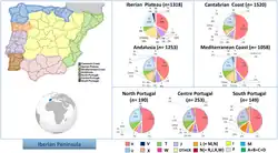 Para efectuar este análisis se analiza una muestra de 2.919 individuos de España, Europa, África del Norte y África subsahariana. Como resultado se pueden identificar 29 grupos de donantes no ibéricos y se infieren seis grupos distintos dentro de Iberia. Los seis grupos se asocian con regiones geográficas, predominantemente en la dirección este-oeste en lugar de norte-sur.[36]