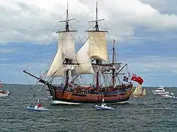 A lo largo de la Edad Media, se utilizaban varios tipos distintos de embarcaciones. El drakkar fue un tipo de nave que se desarrolló durante varios siglos y fue perfeccionado por sus usuarios más famosos, los vikingos, aproximadamente en el siglo IX.[38] Las naves se construían a partir de la estructura formada por la quilla, la roda y el codaste; listones de madera superpuestos mediante el método de casco trincado completaban el casco de la embarcación.[39][40] El knarr, de similar diseño, era un tipo de buque de carga. Difería del drakkar en que era más grande y su propulsión dependía únicamente de su vela cuadrada.[41] La coca era un diseño que se cree que evolucionó, —o al menos fue influenciado—, a partir del diseño del drakkar. Fue ampliamente utilizado en el siglo XII y se construía también mediante el método de casco trincado, o tingladillo. El antecedente directo de la carabela, era una nave inventada en la Iberia islámica y utilizada en el Mediterráneo desde el siglo XIII.[42][43] A diferencia del drakkar y la coca, usaba un método constructivo llamado solape liso, donde los tablones del casco se ajustaban lado a lado, sin superposiciones. Podía ser de vela cuadrada (carabela redonda) o de vela latina (carabela latina).[44] La carraca era otro tipo de barco desarrollado en el Mediterráneo en el siglo XV. Era un velero más grande que la carabela, cuyo exponente más famoso fue la Santa María, navío con el que la expedición de Cristóbal Colón llegó a América.[45]