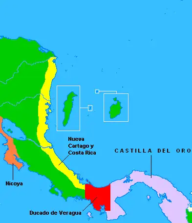 La gobernación de Castilla de Oro que comprendía la parte este de la primigenia gobernación de Veragua, cuyos límites orientales y sudorientales llegarían respectivamente hasta el río Atrato y la bahía de Buenaventura, comenzó a expandirse hacia el occidente con Pedro Arias Dávila, adquiriendo en 1524 los territorios de la nueva Villa de Bruselas y de las urbes de Granada y de León, las cuales se separaron en 1527 para conformar la provincia de Nicaragua, que dependería de la Real Audiencia de Santo Domingo (hasta 1539). Finalmente la toponimia de Tierra Firme comenzó a circunscribirse a la parte oriental de Costa de Oro en el año 1535 y cuando su territorio central pasó a conformar el Ducado de Veragua el 19 de enero de 1537 —que se lo concedieron a Luis Colón, nieto del gran almirante, como consecuencia del laudo arbitral dictado en julio de 1536 que puso fin a los pleitos colombinos— quedó dividida en dos porciones, disponiéndose por real cédula del 3 de marzo del mismo año que toda la Veragua Real (La porción sobrante de la extinta gobernación de Veragua) sea de la Gobernación de Tierra Firme. Posteriormente en 1540, se dispuso que las tierras desde el golfo de Nicoya hasta la frontera del ducado, fuesen segregadas de Castilla del Oro y unidas al territorio de la Veragua Real para conformar la provincia de Nueva Cartago y Costa Rica. |