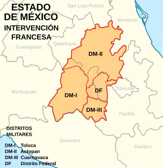 Al inicio de la Intervención Francesa, el 3 de agosto de 1862, estando en retirada en la ciudad de Toluca, el presidente Juárez crea tres distritos militares en el Estado de México con la anuencia del gobernador Francisco Ortiz Zárate.[6]