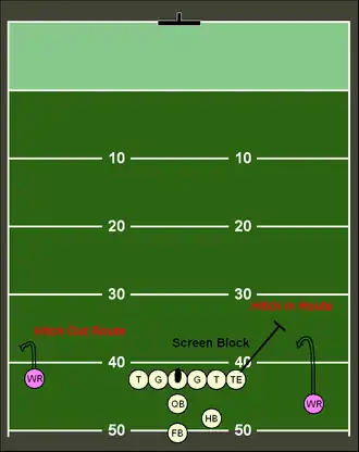 Esta ruta también puede ser usada en lo que se conoce como pantalla, donde mientras el receptor está atrapando el balón, uno o más linieros, tight ends, o running backs correrán en dirección del receptor para bloquear a los jugadores defensivos que pudieran estar en persecución del receptor y darle espacio para correr después de atrapar el balón.
