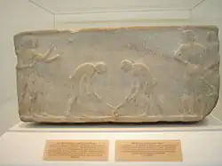 Griegos antiguos jugando al keretízein, relieve en mármol del 500 a. C.del Cerámico en Atenas. En exhibición en el Museo Arqueológico Nacional de Atenas.