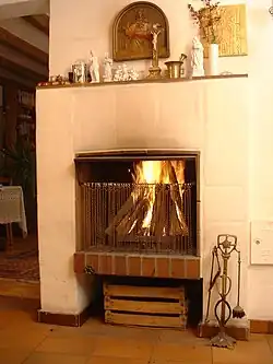 Históricamente, se utilizaban para calentar una vivienda , cocinar y calentar agua para lavar la ropa y usos domésticos. Un fuego está contenido en una cámara de combustión o en un pozo de fuego; una chimenea u otro conducto de humos permite que escapen los gases de escape. Una chimenea puede tener lo siguiente: una base, un hogar, una cámara de combustión, una repisa, una grúa de chimenea (utilizada en chimeneas de cocina y lavandería), una parrilla, un dintel, una barra de dintel, una repisa de chimenea, una compuerta, una cámara de humos, una garganta, un conducto de humos y un filtro de chimenea o postquemador.[2]