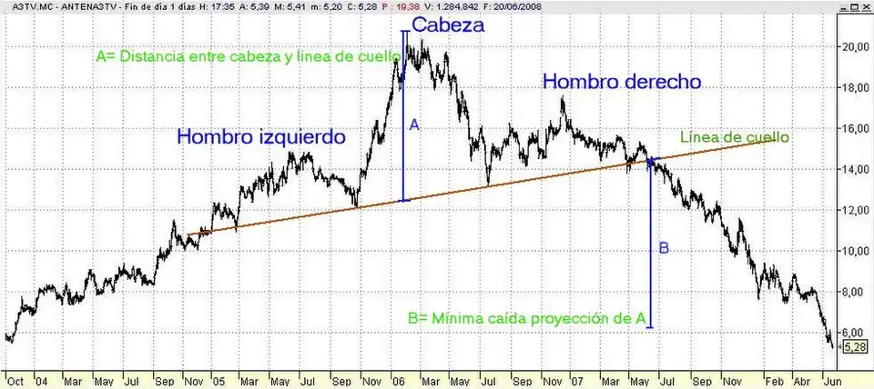 La clásica figura de hombro - cabeza - hombro se manifiesta al final de una tendencia e implica un cambio de ella, bien sea alcista para pasar a bajista, o bien sea bajista para pasar a alcista. A este patrón se le atribuye un alto porcentaje de fiabilidad.
