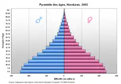 La población de Honduras supera los 10 millones de habitantes, dedicada en su mayor parte a las actividades agropecuarias, además del comercio, manufacturas, y servicios públicos entre otras actividades. El departamento de Honduras con mayor densidad de población es Cortés con 400.3 hab./km².[16] El país es multiétnico. La población mestiza constituye la mayoría poblacional. También existe población de diversos pueblos indígenas como los lencas, nahuas, misquitos, tolupanes, mayas chortís, pech, tawahkas, garífunas, pueblos negros de habla inglesa y zambos de habla hispana y misquita.