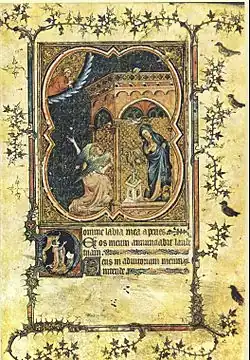 Debajo de una miniatura de la Anunciación en el folio 13v, la inicial D representa una figura situada bajo una cortina dorada delante de una decoración mural cubierta de flores de lis.[2] Se ha sugerido que esta figura representa a Felipe el Hermoso.[2] Como en las escenas tradicionales de la Anunciación, el arcángel Gabriel aparece por el lado izquierdo de la escena y señala a los ángeles del cielo y a Dios con un movimiento dramático. [3]
