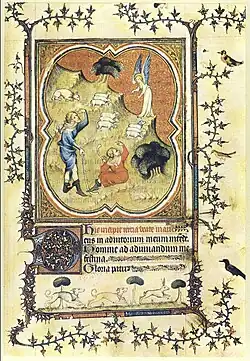 En la Anunciación a los pastores del folio 100r, dos pastores sostienen houlettes, herramientas utilizadas para recoger piedras y arrojarlas a las ovejas desobedientes cuando se alejan del rebaño. Un perro lleva un collar de púas para proteger a los pastores y a las ovejas de los ataques de lobos o bandidos. El perro contempla con desconfianza al ángel que se cierne sobre la escena.[3]