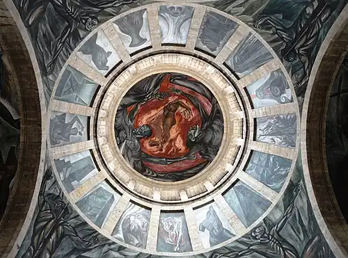 El hombre de fuego es el segmento mural que José Clemente Orozco realizó sobre la cúpula de la capilla mayor. El maestro optó por la técnica del fresco en la cúpula de 11 metros de diámetro interior y 27 metros de altura. En este mural como otros de Orozco expresa varios momentos de la historia de México abordando la conquista, la época virreinal y los tiempos modernos. En los frescos, Orozco hizo referencia a la vida prehispánica, al choque cultural durante la conquista, a la fundación de Guadalajara y tocó escenas de la trágica realidad contemporánea. El mural el hombre de fuego, en el cual se aprecia una figura humana que «escapa por una bóveda o cúpula ‘abierta en gloria’, como en la pintura barroca», es la pieza clave del conjunto muralístico pues borra cualquier cualidad meramente decorativa y le otorga una nueva dimensión al espacio al convertirlo en uno dedicado a una nueva devoción, la de la cultura. Respecto al mundo prehispánico y hace referencia a los sacrificios humanos en la América precolombina. También es una obra crítica de la traición, la corrupción, el desorden y la injusticia de una sociedad que cae cada vez más en la barbaridad. Para Justino Fernández, este mural es «la concepción cumbre y más original del artista» y representa al ser humano «superior [que] ve, discierne y ordena»; en suma, una alegoría de la existencia humana, que «todo existir en conciencia es ardorosa consunción».[11][12]