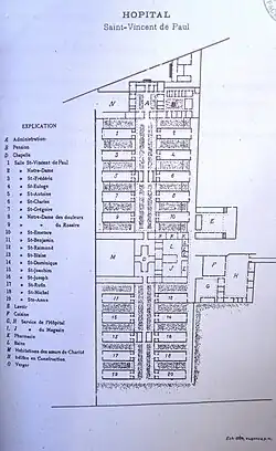 A cargo del hospital estaban las Hermanas de la Caridad de San Vicente de Paul, una congregación de nacionalidad francesa, que en 1663 había fundado el célebre sacerdote Vicente de Paul. Este santo, canonizado en 1737, fue el primer educador de la asistencia voluntaria, por cuanto reclutó a personal profesionalizado y lo preparó mediante cursos teóricos y prácticos que constituyeron en realidad la más antigua escuela de enfermeras del mundo. Fueron ellas quienes instalaron y establecieron la capilla en el patio central del sanatorio, la cual fue declarada Monumento Histórico en 1981.[1]