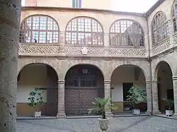 El interior del edificio destaca el patio de planta cuadrada, rodeado de galerías en dos pisos, todo ellos realizado en piedra. Los arcos son redondos, con algo de peralte; aparecen cuatro arcos en cada lado del patio, excepto el lado que se corresponde con la entrada a la capilla, en el que hay tres arcos carpaneles. Las columnas simulan el estilo dórico. En el piso de arriba existe otra hilera de arcos, pero con menos altura y con antepechos de claraboyas de estilo gótico.