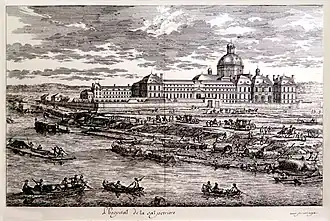 Su construcción inicial fue encargada por Luis XIV al arquitecto Libéral Bruant en abril de 1656. Se eligió como emplazamiento un solar donde había un pequeño polvorín. El edificio recibió el nombre de Hôpital Général pour le Renfermement des Pauvres de Paris (Hospital general para el internamiento de los pobres de París) y tenía como propósito principal internar a los pobres y vagabundos de la ciudad. Se dividió en tres partes: La Pitié, para los niños, Bicétre para los hombres y La Salpêtrière para las mujeres. En 1684, la parte de La Salpêtrière fue ampliada con un edificio que servía como lugar de reclusión a las mujeres denunciadas por sus maridos o padres. Se añadió una zona carcelaria para las prostitutas. A las puertas de la Revolución francesa el hospital tenía una capacidad para diez mil enfermos y sus dependencias penitenciarias alcanzaban hasta trescientos detenidos.