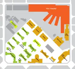 Plano del hospital de San Pablo. En verde los pabellones modernistas de Domènech i Montaner; amarillo y marrón, los pabellones de Domènech i Roura; en rojo el nuevo hospital