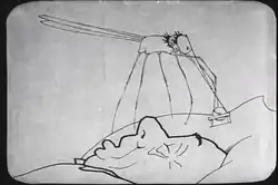 Un hombre mira aprensivamente a su alrededor antes de entrar en su habitación para irse a dormir. Un mosquito gigante (con sombrero y maletín) entra a través de un ventanuco, después de darse cuenta de que es demasiado grande para entrar por la cerradura de la puerta. El mosquito pica varias veces al hombre mientras duerme, quien trata de espantar a su agresor, sin lograrlo. Finalmente, el mosquito chupa hasta quedar tan lleno, que explota.
