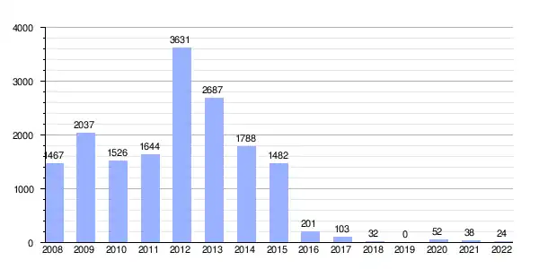 | Gráfica de evolución de la deuda viva del Ayuntamiento de Huéscar entre 2008 y 2022 |