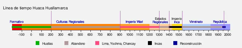 La construcción de la pirámide de Huallamarca, empezó con los Huallas desde el año 200 a.c hasta el 200 d.c, colocaron plataformas una encima de la otra para lograr diferentes niveles donde se alzaron edificios, recintos y pasadizos.[17] Estos lo utilizaron como un centro ceremonial, por lo que se considera como el primer momento de la huaca. Posteriormente fue abandonado y reutilizado, lo que se conoce como el segundo momento, en el que se usó como cementerio desde el 900 d.c hasta el 1300 d.c por las culturas Lima, Yschma y Chancay.[17] El tercer momento, ocurrió durante la época incaica, desde 1400 d.c hasta 1532 d.c en el que la huaca fue usada como un edificio público, pues se encontraron alimentos, textiles y grandes vasijas.[17]