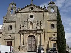 Colegio de Jesuitas: colegio fundado a instancias del clérigo optense Estaban Ortiz, que donó los terrenos y las rentas para su sostenimiento. En 1570 llegaron los primeros religiosos y poco tiempo después se pusieron en marcha las escuelas de primeras letras y de gramática. Expulsados los jesuitas en 1767, el edificio continuó su actividad docente por medio del clero secular. Las obras se inician en la segunda mitad del siglo XVI, época de la que se conserva el tramo de la fachada situada a la izquierda de la portada del templo. Durante el primer tercio del siglo XVII –coincidiendo con la primera fase del barroco español- se construyeron la casa conventual –con patio columnado y hermosas estancias abovedadas– y la airosa y esbelta espadaña, que se levanta por encima de toda la construcción. La iglesia fue iniciada en agosto de 1700 y su diseño se atribuye a los arquitectos Juan de Sierra Torres y Tomás del Campo, siendo concluida tres años después por los maestros Juan de Palacios y Cristóbal de Hernansaiz, que construyen el crucero y transepto del templo. La planta es típicamente jesuítica, consta de una nave con tribunas, cubierta por bóvedas de lunetos y una cúpula de media naranja sobre el crucero. Elemento destacado es la portada del templo, con doble pilastra y estípites, donde se incorporan las armas reales y la inscripción de Carlos III, que ordenó en 1770 el traslado a este templo de la parroquia de San Nicolás de Medina, conocida desde entonces como San Nicolás el Real. Convertido el templo en parroquia, la hermandad de la Virgen de Guadalupe manda construir la bella capilla de estilo rococó atribuida al arquitecto José Martín de Aldehuela. En 1795, la hermandad de San Juan Evangelista, procedente de la parroquia de Santa María de Atienza, construyó una bella capilla de corte academicista atribuida al arquitecto Mateo López. En la actualidad el templo es mantenido por las hermandades de San Antonio Abad, Nuestra Señora de Loreto y San Juan Evangelista con muy importantes fiesta el segundo fin de semana del mes de mayo. En 2004 se declara el edificio como Bien de Interés Cultural.