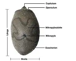 La morfología del huevo maduro es muy variada entre órdenes de insectos. Los planos de simetría dorso-ventral y cabeza-cola se evidencian en la morfología externa del huevo, y ya se observan desde su formación. Muchas veces se puede reconocer a qué insecto pertenece el huevo por su morfología externa (se dice que la morfología externa del huevo tiene “valor taxonómico”). A pesar de su variada morfología, aun así se reconoce un esquema generalizado del huevo que está muy conservado evolutivamente. El huevo en un esquema generalizado consta de un ovocito con nutrientes ("yema"), envuelto por la membrana vitelina (que contiene más nutrientes), y 4 capas de corion protector, cada una con sus características químicas, de adentro hacia afuera: la capa de ceras, la capa cristalina interna, el endocorion y el exocorion[nota 3]​). Se llama cáscara al conjunto de las capas de membrana vitelina y corion.