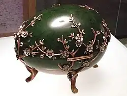 El huevo de las flores de manzano está hecho en forma de joyero, puesto de lado y abriéndose a lo largo, no vertical y abriéndose a lo ancho, y es uno de los huevos más grandes de todos los elaborados por Fabergé. En su diseño, hay una clara influencia del Art Nouveau y el estilo japonés de moda en la época. Las dos mitades huecas del huevo están hechas de nefrita verde siberiana, con la superficie increíblemente pulida. El huevo se apoya en cuatro patas doradas talladas en forma de ramas de manzano. Estas ramas de oro rojo y verde se extienden en relieve sobre el huevo en ramitas y nudos, salpicadas de hojas y flores doradas. Los pétalos de las flores están cubiertos de esmalte blanco, y sus centros están hechos de diamantes sobre un fondo rosa.[1][2]