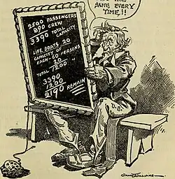 El hundimiento del RMS Titanic fue una catástrofe marítima ocurrida en la noche del 14 al 15 de abril de 1912, cuando el transatlántico británico RMS Titanic —de la naviera White Star Line—, que realizaba su viaje inaugural de Southampton a Nueva York, colisionó con un iceberg en el norte del océano Atlántico frente a las costas de Terranova. La colisión se produjo en el lado de estribor a las 23:40 del 14 de abril,[3]​ lo que provocó el hundimiento del barco en menos de tres horas, a las 02:20 del 15 de abril.[4]​ Fallecieron unas 1500 personas por golpes diversos, caídas, ahogamiento o hipotermia, lo que convirtió a este naufragio en el más fatal de la época y en una de las mayores tragedias marítimas en tiempo de paz. Numerosas personalidades perecieron durante el naufragio, entre las que se encontraban los millonarios Benjamin Guggenheim, Isidor Straus y John Jacob Astor IV.