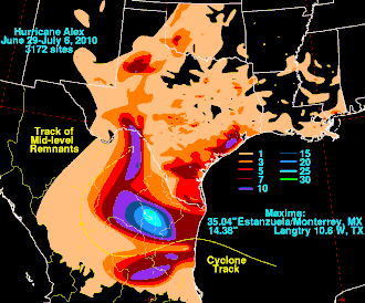 - ↑ Brownsville Weather Forecast Office (25 de agosto de 2010). «Alex Spares the Valley Early Season Disaster». National Weather Service. Archivado desde el original el 25 de noviembre de 2011. Consultado el 6 de septiembre de 2010.
