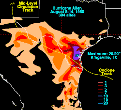 Allen dejó de 255 milímetros (10,04 plg) a 510 mm (20,08 plg) de lluvia en el sur de Texas, poniendo fin a una larga sequía de verano durante la ola de calor en Estados Unidos de 1980. Su mapa de precipitaciones totales se muestra a la derecha.[14]