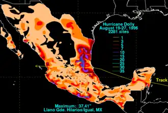 El huracán Dolly causó inundaciones en todo México en agosto de 1996. La cuarta tormenta nombrada y el tercer huracán de la temporada de huracanes del Atlántico de 1996, Dolly se desarrolló a partir de una onda tropical al oeste-suroeste de Jamaica el 19 de agosto. Inicialmente una depresión tropical, el sistema se fortaleció a tormenta tropical unas doce horas después. Dolly se dirigió hacia el oeste y se intensificó a huracán de categoría 1 a finales del 20 de agosto. Luego tocó tierra cerca de Chetumal, Quintana Roo. El sistema se debilitó a depresión tropical el 21 de agosto. Más tarde ese día o temprano el 22 de agosto, Dolly emergió en la Bahía de Campeche y rápidamente volvió a fortalecerse a tormenta tropical. La tormenta se profundizó aún más y se actualizó a huracán nuevamente al mediodía del 23 de agosto; Dolly simultáneamente alcanzó su punto máximo con vientos de 80 mph (130 km/h). Alrededor de esa fecha, golpeó entre Tuxpan, Veracruz, y Tampico, Tamaulipas. Dolly se debilitó rápidamente a depresión tropical la madrugada del 24 de agosto, pero se mantuvo intacta mientras cruzaba México y se disipó sobre el Océano Pacífico oriental el 25 de agosto.