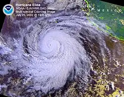 ![]() Vista imagen de satélite, el huracán Elida convirtiéndose como un poderoso huracán de categoría 5 el 24 de julio de 2002 | ||